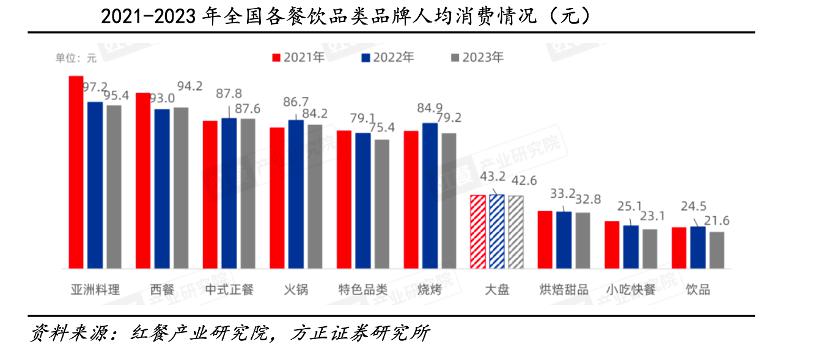 根据招商证券信息披露,2024 年 Q1,百胜中国旗下肯德基的销量同比增长 4%,平均客单价同比下降 6%。必胜客的销量同比增长 8%,平均客单价同比下降 12%。九毛九旗下太二餐厅的平均客单价在 24 年一季度下降至人民币 73 元,而 2023 年上半年和 2023 年下半年分别为人民币 75 元 .