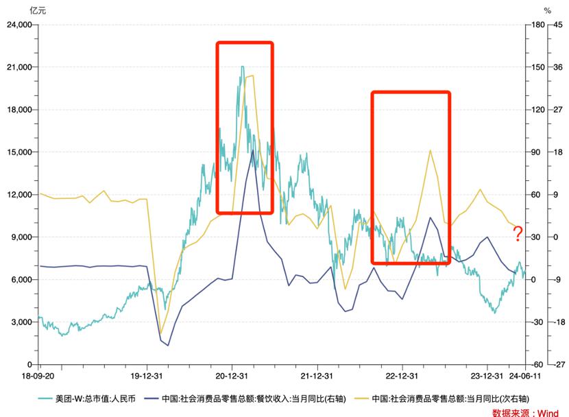 其二,美团市值的长期走势与社零和餐饮大盘息息相关,若 8 月前后行业走出超预期形态,则有利于下一阶段美团市值的表现,反之则是利空。