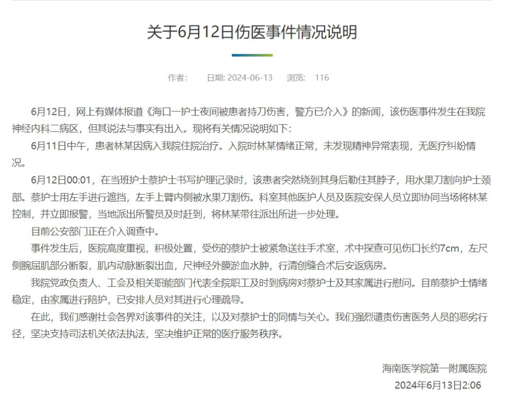 6 月 13 日,海南医学院第一附属医院发布关于 6 月 12 日伤医事件情况说明。全文如下: