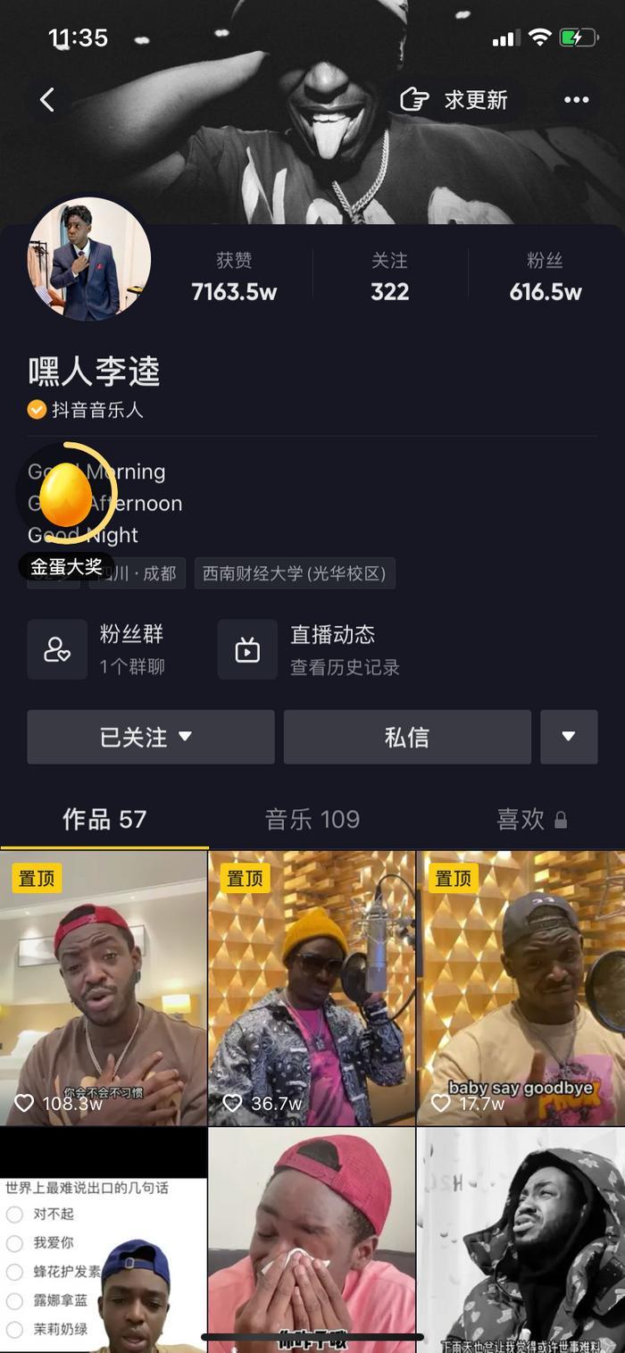 2020年,在四川成都打拼的非裔音乐人“嘿人李逵”的一首《卡哇伊》在抖音走红,在活动期内歌曲累积播放量突破15亿。今年 ,他以一曲《Shake That》在看见音乐计划说唱赛道中热度排在第三,再度引发行业关注。