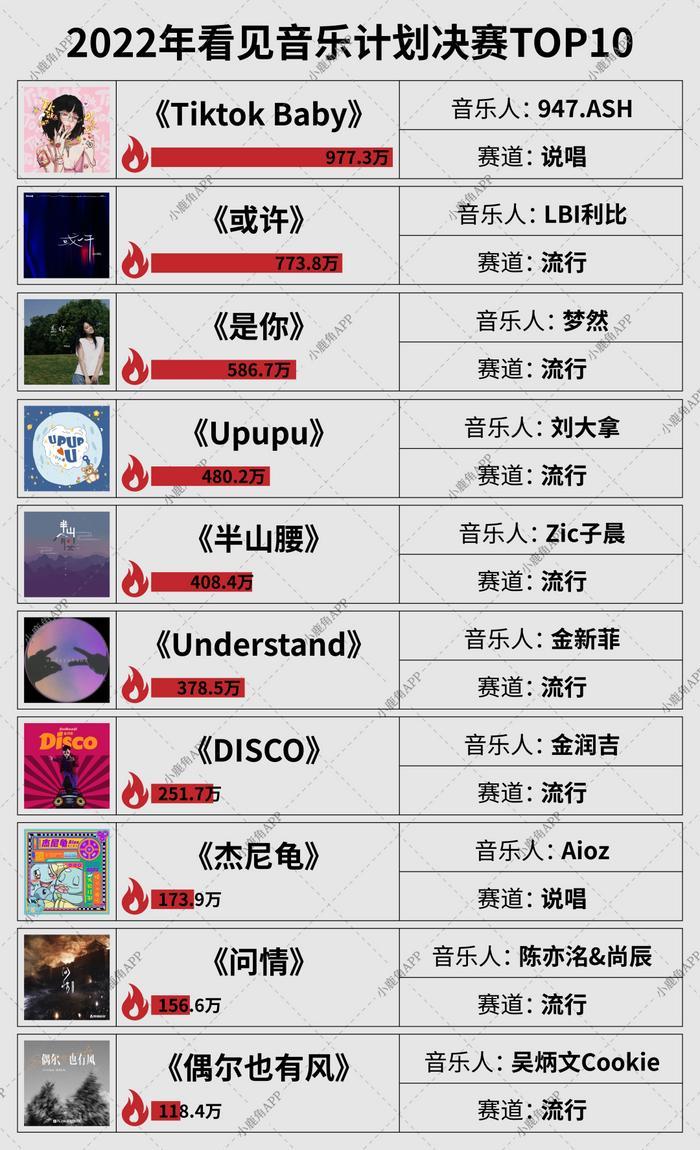 从Top10的代表作品数据来看,《或许》参赛53天,吸引投稿量118W+,播放55亿+;《半山腰》参赛46天,吸引投稿12万+,播放量6.2亿;《Tiktok Baby》参赛53天,吸引投稿32W+,播放20亿+。