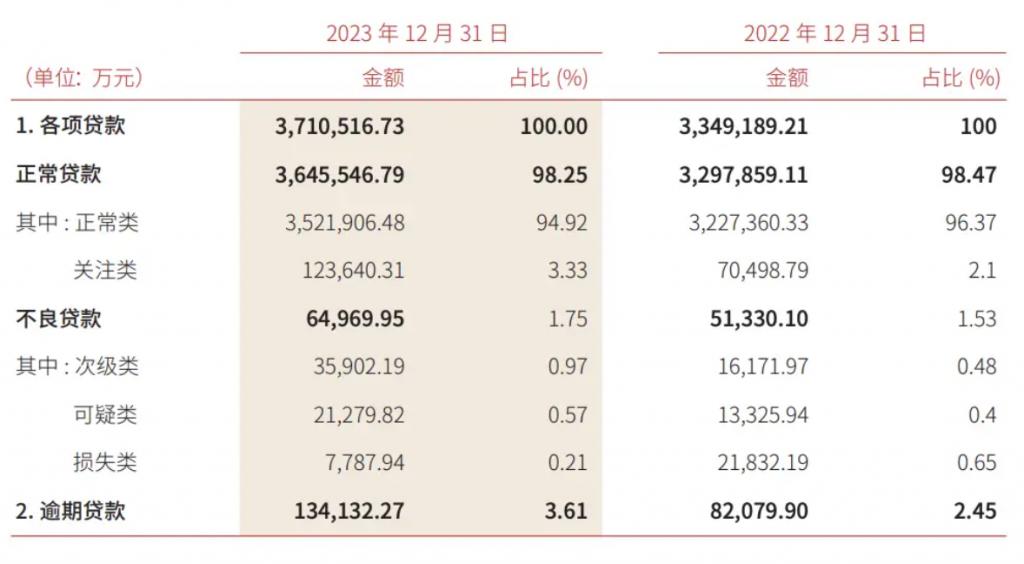 截至 2023 年末,最先因招聘催收人才而出圈的三湘银行的贷款余额为 371.05 亿元;不良贷款率 1.75%,不良贷款余额为 6.50 亿元,较上年末增加 1.37 亿元;逾期贷款率 3.61%,逾期贷款余额为 13.41 亿元,较上年增加 5.20 亿元,增幅高达 63%。