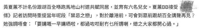 所以对于胡百全她已经没有任何的遗憾,此次离开香港移民美国,她直言不会去胡百全的墓前与对方说再见,因为该说的早就已经说过了,而且时间已经过去了那么久,很多事情都不需要再重提,总之大家开心就好。也许,黄夏蕙更想表达的是不管她人在哪里,胡百全都永远都在她心中,与她同在。