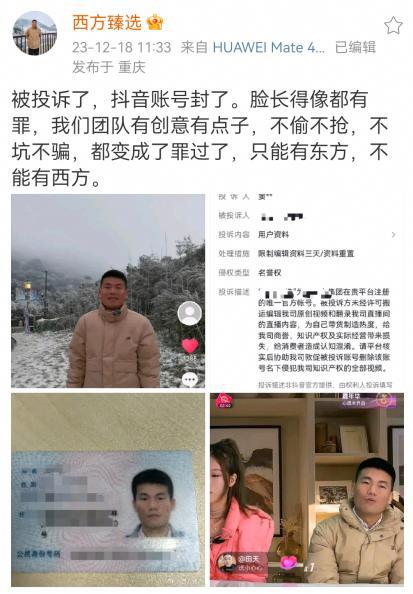 西方臻选则注册微博账号,直言被东方甄选举报,还晒出身份证," 脸长得像都有罪,我们团队有创意有点子,不偷不抢,不坑不骗,都变成了罪过了,只能有东方不能有西方 "。