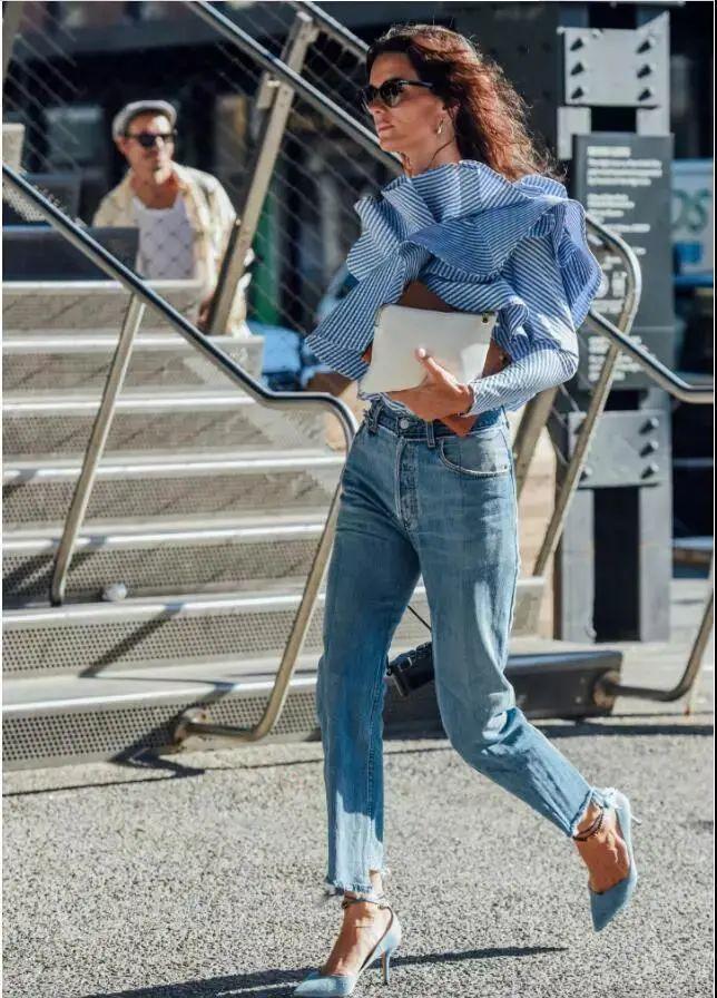条纹衬衫搭配牛仔裤,