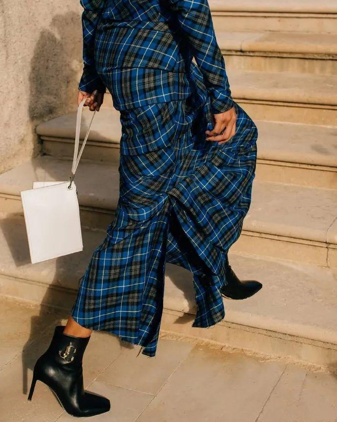 一身蓝色格纹裙,
