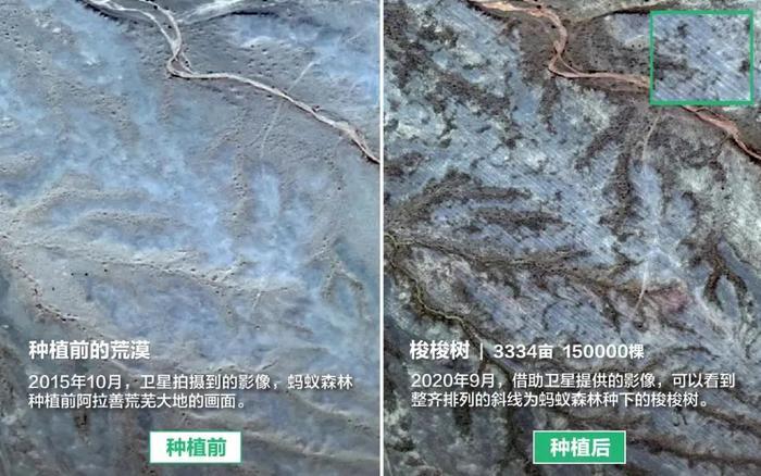 内蒙古阿拉善蚂蚁森林种植前后对比。