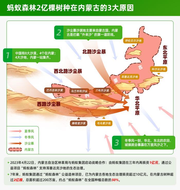 内蒙古也是蚂蚁集团参与支持生态治理的重中之重。据内蒙古林草局统计,7年来,蚂蚁集团为内蒙古的生态治理累计捐资超过10亿元,累计捐种了超过2亿棵树,总面积超过200万亩,约占蚂蚁森林在全国种植总数的50%。