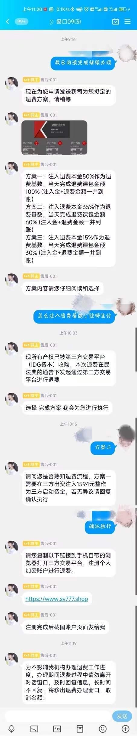 此时,小南已大概率确认对方是骗子了。他想试试看最后能到哪一步,于是,他选择了“注入退款本金的35%”的方案二,并给客服发送了确认执行。“客服”发给他一个网站,要他注册账号,并在该网站的用户咨询页面,要求小南往一个银行户头转账。
