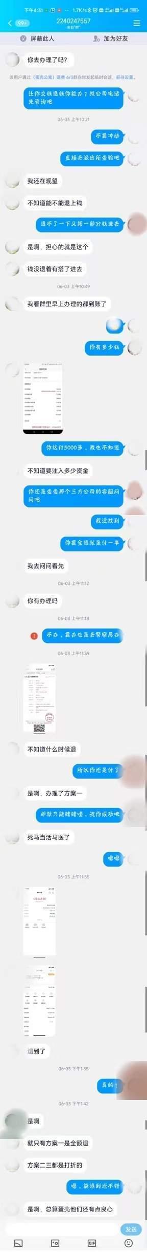 小南甚至收到了来自退款群两个“租客”的私聊,对方一上来就问小南你去办理了吗?小南表示不要冲动,让对方去派出所查验。对方便开始表示,自己也在担心钱进去出不来。后来对方发来的付款截图,说了一句“死马当活马医”。小南原以为对方一定被骗了,结果不久后对方发来了退款成功的截图,说了一句,“总算蛋壳还有良心。”