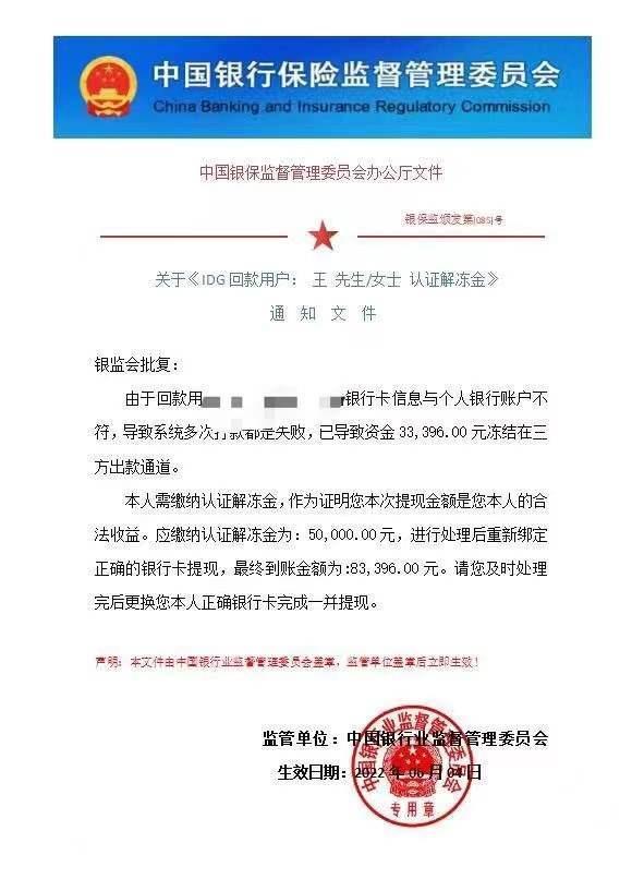 这时的陈麦依然沉浸在马上可以提款的激动中,然而这笔款项又“出了问题”。客服告诉陈麦,由于他在转账时,输入的账号多打了一个数字,导致回款失败,汇款资金被冻结,需要解冻证明和5万元保证金,才能顺利解冻。对方发来了“银保监会”的文件,陈麦仔细检查了一遍栏头和右下角的章,觉得没问题。但此时他的卡里的钱已经没有5万了,他从另一张卡转了点钱。就在他凑钱的间隙,对方频繁发来消息,提醒陈麦尽快汇款,否则将取消他的退款名额。