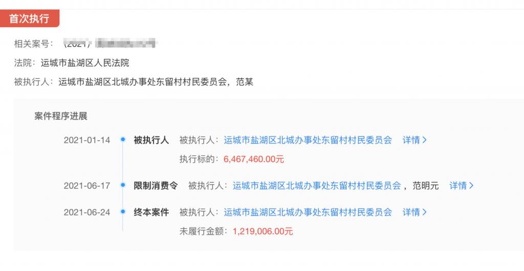 天眼查信息显示,2021 年 1 月,东留村村委会成被执行人,执行标的为 646 万余元。同年 6 月,被执行人 " 东留村村民委员会,范明元 " 收到限制消费令,未履行金额为 121 万余元。