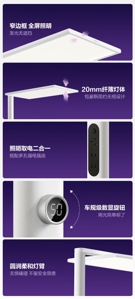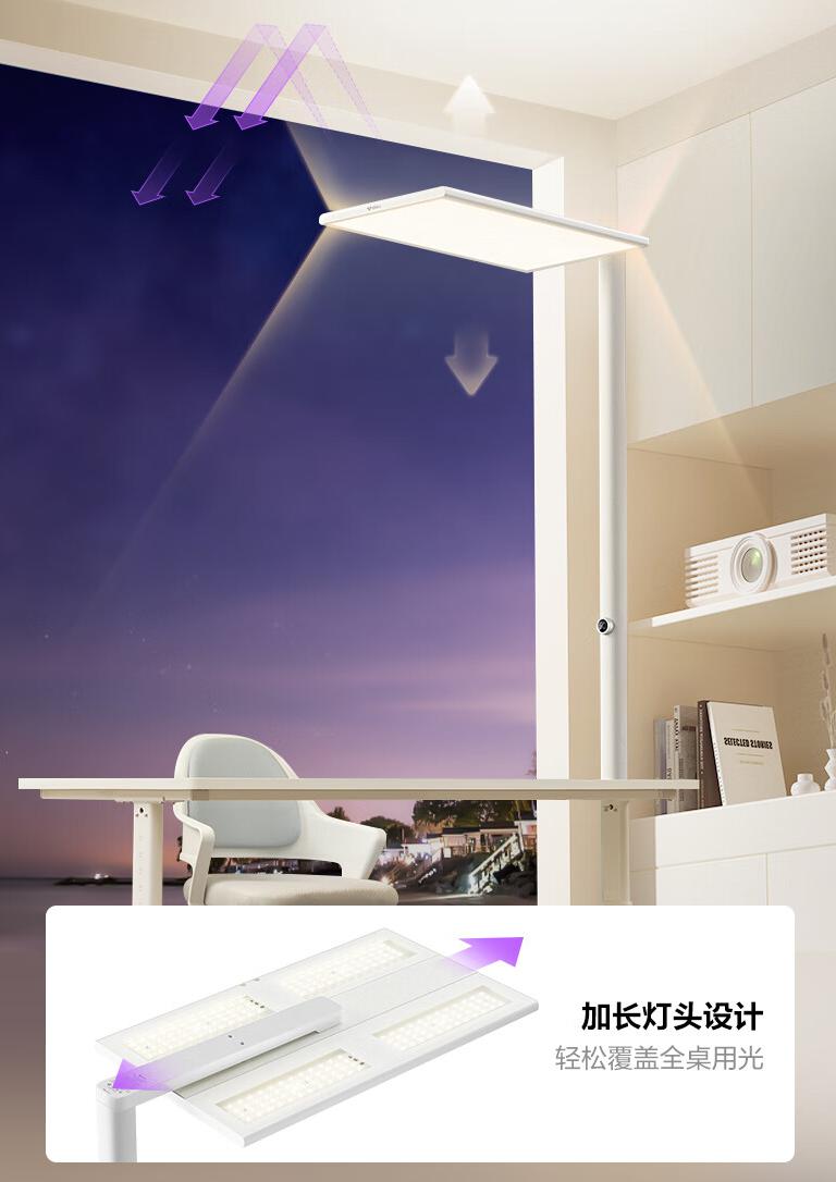 该台灯采用无遮挡全屏照明和加长灯头设计,平均照度达 2200Lux;双重照明设计,6000lm+3000lm 上下比例配光,下发光照亮学习区域,上发光减少环境暗区。