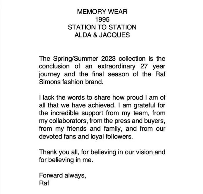平地一声雷,11月22日,Raf Simons通过社交媒体发布公开信,宣布关闭其个人同名品牌,其于10月在伦敦发布的2023春夏系列将成为最后一舞。