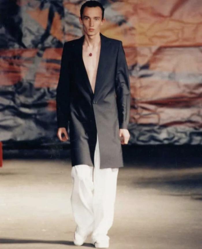青年时的境遇决定了他贯彻始终的左派立场,他不是含着金汤匙出生的时装集团公子,也不是设计师家庭里耳濡目染的天才,Raf Simons来自街头,太了解街头是什么样子,这场名为Memory Wear的秋冬系列显而易见定下了这个品牌往后27年的基调,线条分明的外套与垂坠盖过脚面的裤子,满屏幕代表着反叛的黑色,随后在1996年、1997年,Raf Simons稳定地用一个个系列展现着那个年代青年们的日常生活。