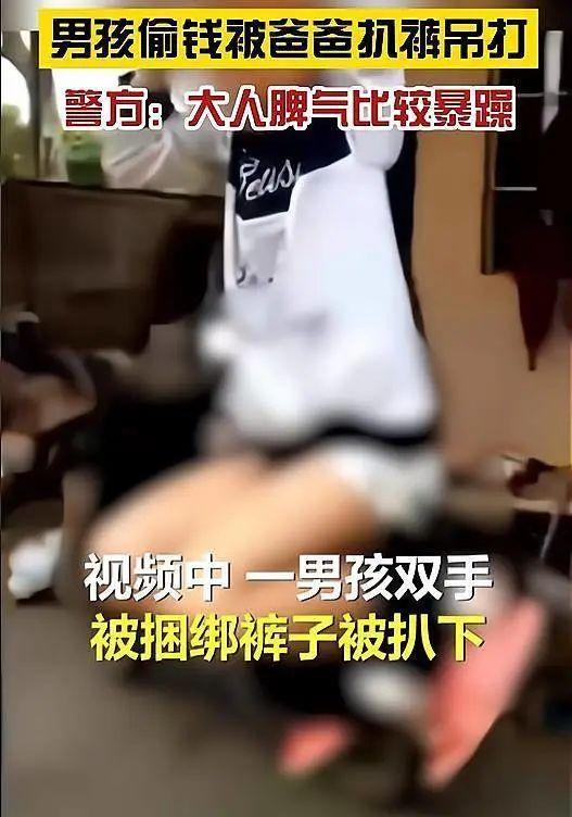 原来,小男孩是因为偷拿了家里的钱,才被吊起来抽打,打人的正是孩子的爸爸。