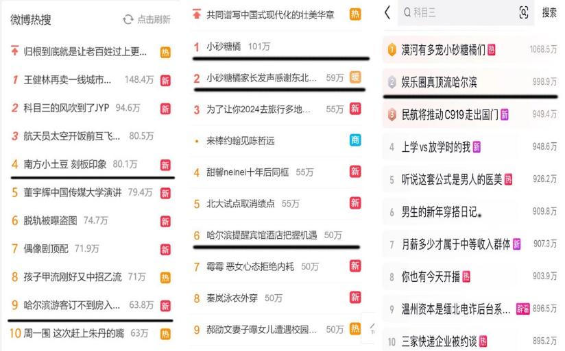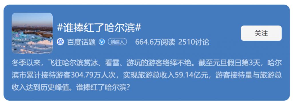 从元旦假期前的 " 南方小土豆勇闯哈尔滨 " 话题热度开始,这场全民关注的 " 小土豆 " 如何玩转哈尔滨,在哈尔滨被 " 宠爱 " 的旅行游记就未停止过。" 小土豆在北方跳了一天雪 "" 鄂伦春族都请来了 "" 哈尔滨游客订不到房入住人大服务中心 "" 三亚冬天败给哈尔滨 " ……几乎是一会儿上一次热搜,一天都不重样,制造的有趣话题根本数不过来。