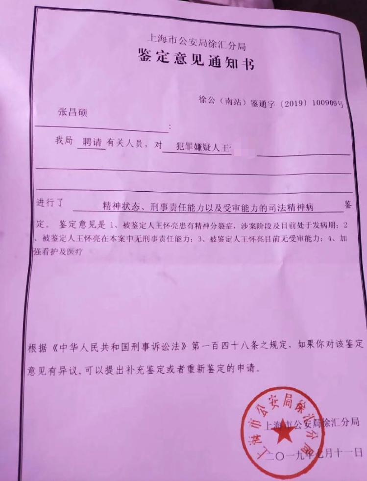 事发当晚,王某便被抓获。王某的精神鉴定情况通知书显示:" 被鉴定人王某患有精神分裂症,涉案阶段及目前处于发病期,在本案中无刑事责任能力、无受审能力,应加强看护及医疗。"