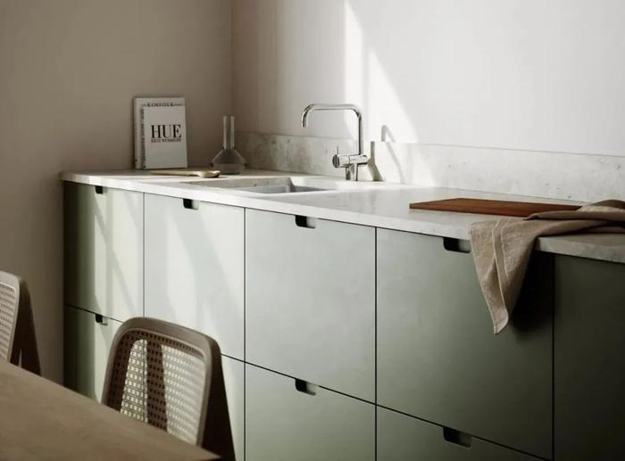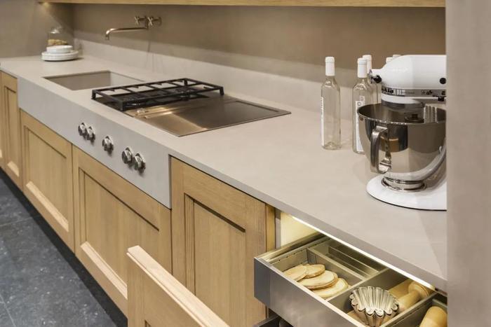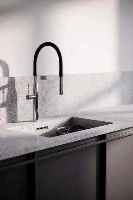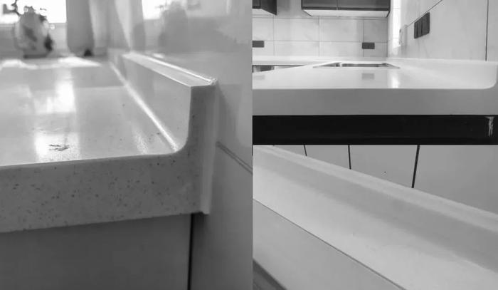 就是在台面前方靠近人的一侧设置挡水条,既能起到阻隔台面水流,防止流淌到地面或者橱柜里,也有效避免积水流淌到地面而导致打滑的问题。