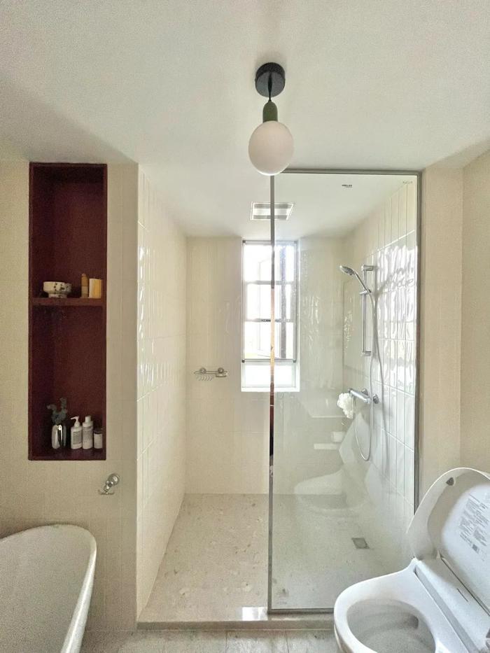 2、砖砌挡水条形状用砖预先砌出挡水条的形状,地砖后期再铺设,这样挡水条不会松动,紧密性有保障,挡水效果也更好;搭配垂直落地的浴室帘会非常好看。