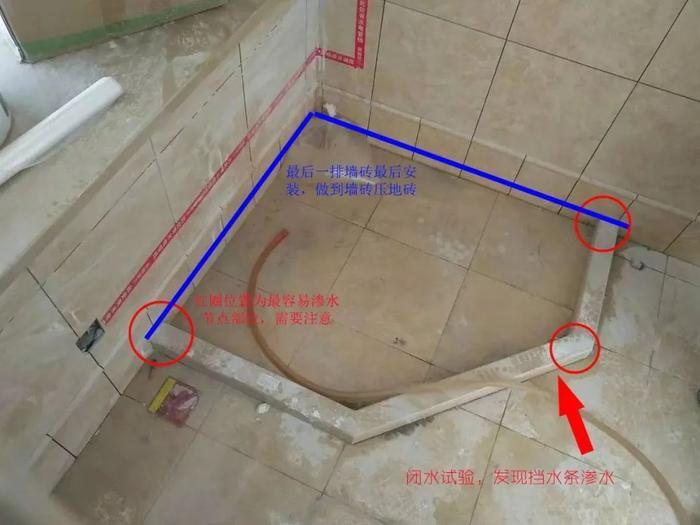 因为这种工艺施工挡水条没有完全把淋浴房内外做到有效隔断。水可以从挡水条底部和侧面渗透出来。