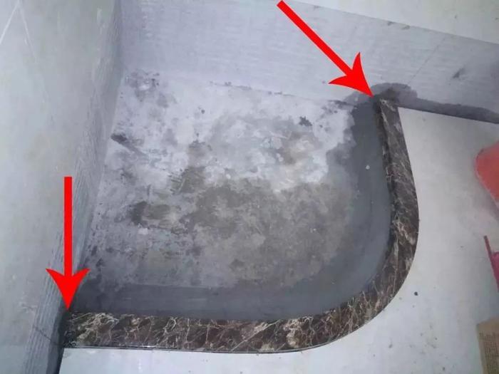 这是目前市面上对卫生间挡水条正确的施工工艺。先做挡水条,再铺贴淋浴房内地面石材,施工中需要注意的是: