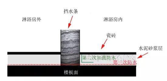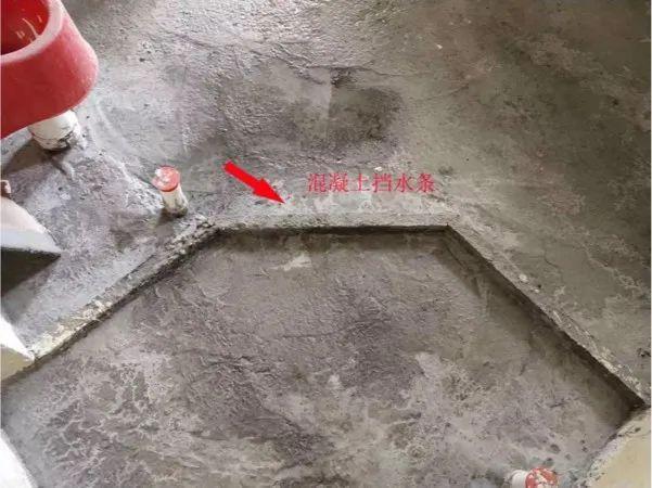 一般工艺是在挡水条内填充湿浆,在做挡水条之前,先用混凝土浇筑一条坎,再做防水,最后做挡水条。