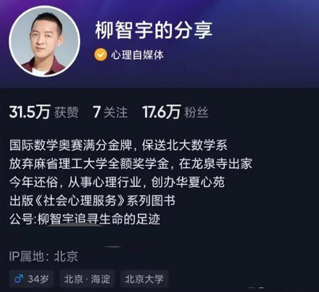 柳智宇早年间展现出非凡的数学天赋顺利保送北大,又获得了麻省理工奖学金准备出国深造,当时他少年成名风头正盛,很多人对他充满期待。结果,他却撂下一句“厌倦了人世”遁入空门,无数人为之震惊和惋惜。