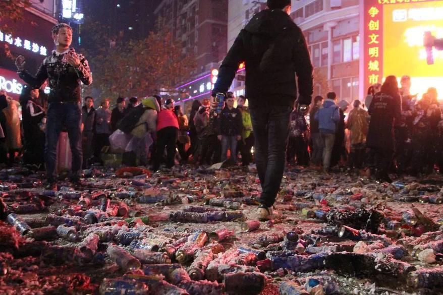 “今天晚上我们这边的环卫工人都来了,就是怕像往年一样留下满地的垃圾打扫不干净。”一位中年女性环卫工边呵着气边说道。但她也感觉到今晚人流较小,来的环卫工多了。说起街道的干净,她觉得人流少是一方面的原因,另一方面就是垃圾桶分布非常合理,西安人的素质也越来越高了。(往年的平安夜街道)