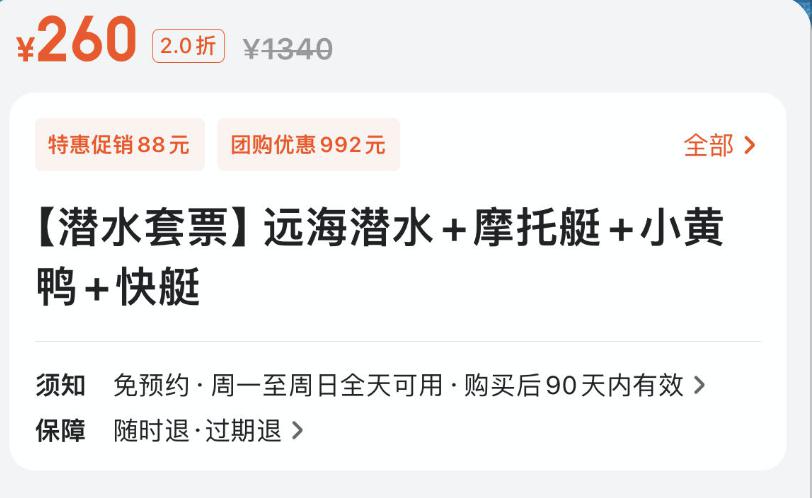 记者来到三亚玛瑞纳酒店码头,商家展板上写着 " 潜水 380 元 / 位 "。通过互联网卖家的介绍,一位摆摊的商家说,交费 260 元,就可以玩潜水、摩托艇、小黄鸭,但没有收据。