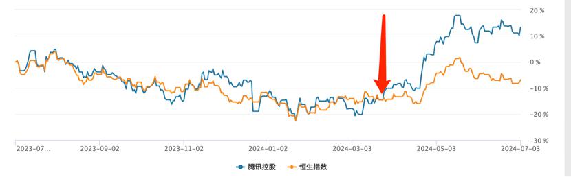 直到 2024 年 3 月下旬之后(腾讯 2023 财报发布日),两条折线才开始逐渐拉开距离,腾讯快速跑赢大盘。自此时开始,市场对腾讯的评判开始由回购开始向基本面侧重。