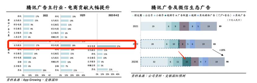 根据交银国际整理,在视频号达到规模效应之前,腾讯广告主分布与大盘相差不大,集中在游戏,文化娱乐等领域,而在 2023 年之后综合电商跃升成为腾讯第一大广告主。