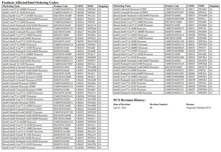 停产的 SKU 型号多达 30 款,涵盖了从入门级的奔腾 Gold 和赛扬处理器到酷睿 i3-10100F / 10105/10300/10305、酷睿 i5-10400F / 10500/10600,以及入门级工作站处理器 Xeon W-1250 等,完整列表详见下图: