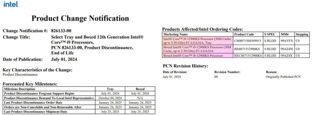 紧接着,英特尔又推出了拥有 24 核心、频率高达 6.0 GHz 的酷睿 i9 系列 KS 特别版处理器,宣告 i9-12900KS 在当前产品线中正式落伍。据 ZDNET 报道,距其正式发布两年三个月后,英特尔也启动了该款处理器的停产程序。虽然目前 i9-12900KS 仍有库存可供销售,渠道商也可能继续接受订单,但英特尔预计将在 2025 年 1 月左右停止供货,并于 2025 年 7 月正式停产该处理器。