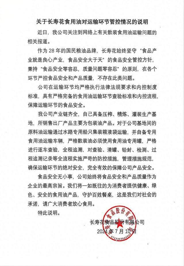 7 月 10 日,长寿花食品官方发布《关于长寿花食用油对运输环节管控情况的说明》: