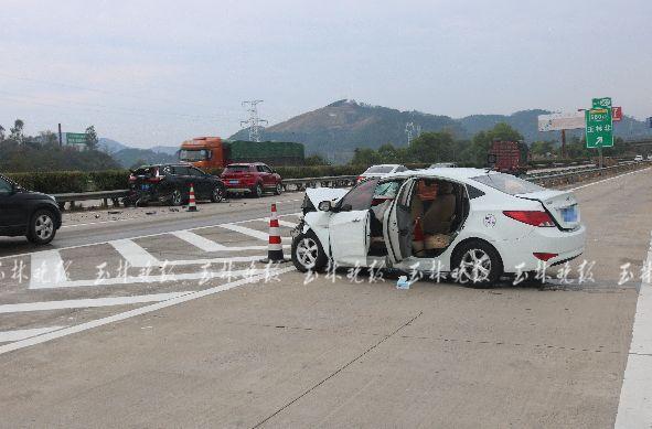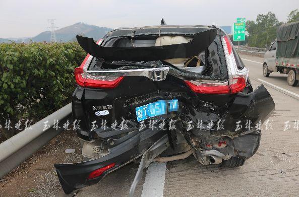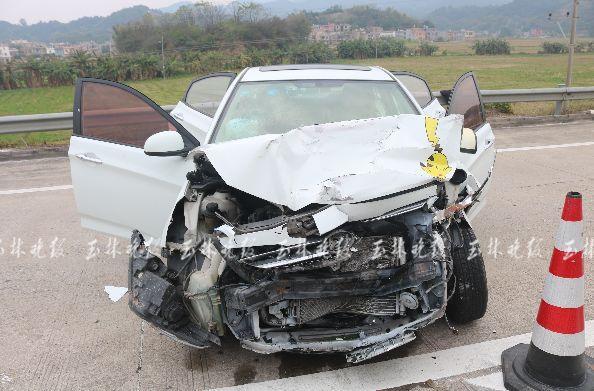 现场,一辆粤J红色长安SUV、一辆粤T黑色本田CR-V前后紧贴着中间护栏停靠在左侧车道边上,而一辆桂A白色北京现代小轿车则横停在匝道上,3辆车辆受损严重,CR-V呈前后内凹状态,现代的安全气囊全部打开,车内血迹斑斑。一名女乘客张某额头挫裂,呈半昏迷状态,经医务人员鉴定,该女子已无生命体征。