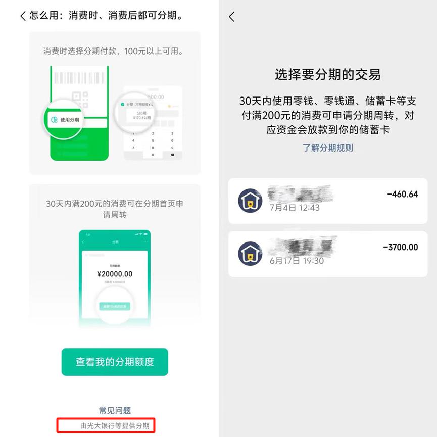 据分期页面介绍,用户消费 100 元以上时可选择分期付款。另一种分期模式是,30 天内使用零钱、零钱通、储蓄卡等已支付满 200 元的消费可申请分期周转,对应资金会放款到用户的储蓄卡。