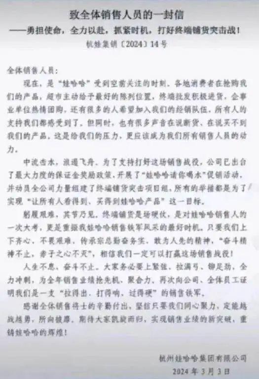 3 月上旬,网络上曾流传署名娃哈哈 " 致全体销售人员的一封信 "。信中提到,现在是娃哈哈受到空前关注的时刻、要打好终端铺货突击战,目标是 " 让所有人看得到、买得到娃哈哈产品 "。