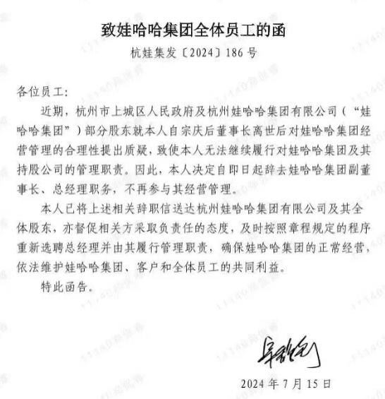 根据截图,该函署名为宗馥莉,函上提到由于娃哈哈集团股东对管理的合理性提出质疑,导致管理推进困难,宗馥莉决定辞去娃哈哈集团副董事长、总经理职务,不再参与经营管理。