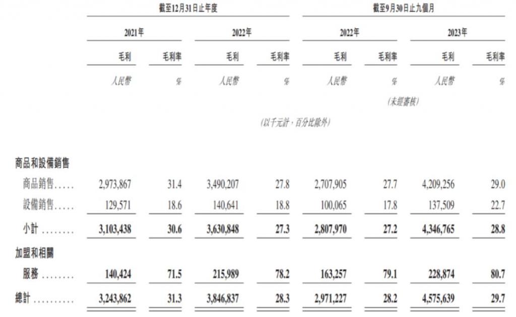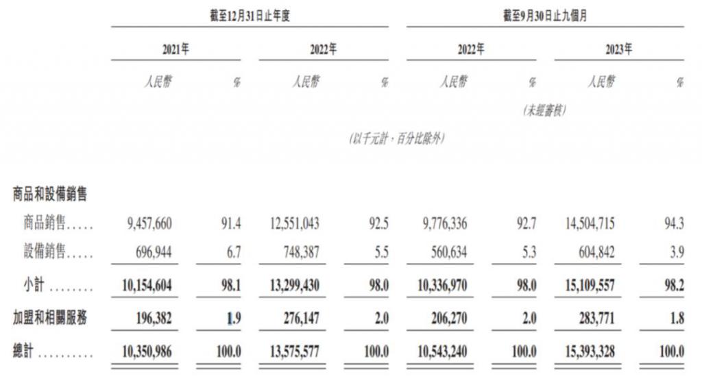 2023 年前三个季度,蜜雪冰城累计实现营业收入 153.93 亿元,同比增长 46%。按收入结构划分来看,销售给加盟商的果浆、包材等物料销售金额为 145 亿元,占比高达 94.3%,门店制作设备销售金额为 6.05 亿元,占比 3.9%,而加盟费相关的收入则仅为 2.84 亿元,占比只有 1.8%。