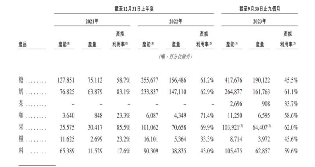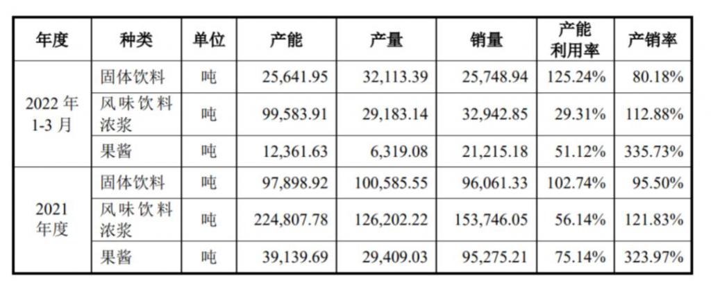 在 2022 年蜜雪冰城向深交所提供的招股说明书中,公司生产的饮品食材产品主要包括固体饮料、风味饮料浓浆、果酱三大类,2021 年累计产能 36.18 万吨,其中固体饮料产能利用率超过 100%。