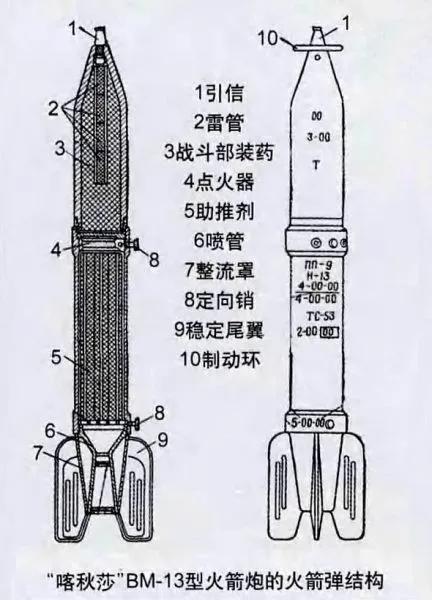 M-13型火箭弹由132毫米薄壁无缝钢管制造而成,尾部焊接四片弹翼,用于火箭弹飞行时稳定,由于是薄壁无缝钢管使得M-13火箭弹的装药量接近8公斤,与152毫米高爆榴弹的装药量相当,所以该型火箭弹的爆炸威力等同于一枚152毫米榴弹,而152毫米在部队里属于重炮,是军师一级直属炮群,只有遇到敌方坚固防御工事和发现敌方大部队集结地时才进行炮击。
