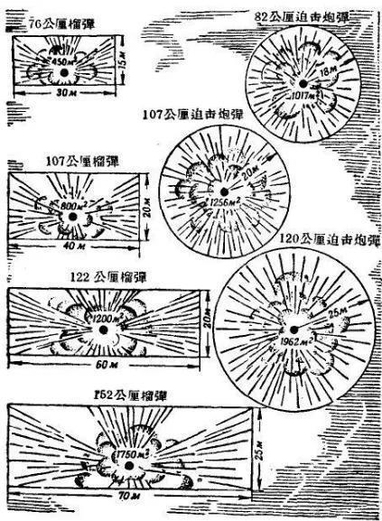 那么152毫米高爆弹的杀伤威力有多大呢?这张图片是炮兵教材里的插图,最下面就是一发152毫米榴弹的弹片和冲击波杀伤面积,高达1750平方米!也就是说在这个范围内即便是处于最边缘也会被伤及到。