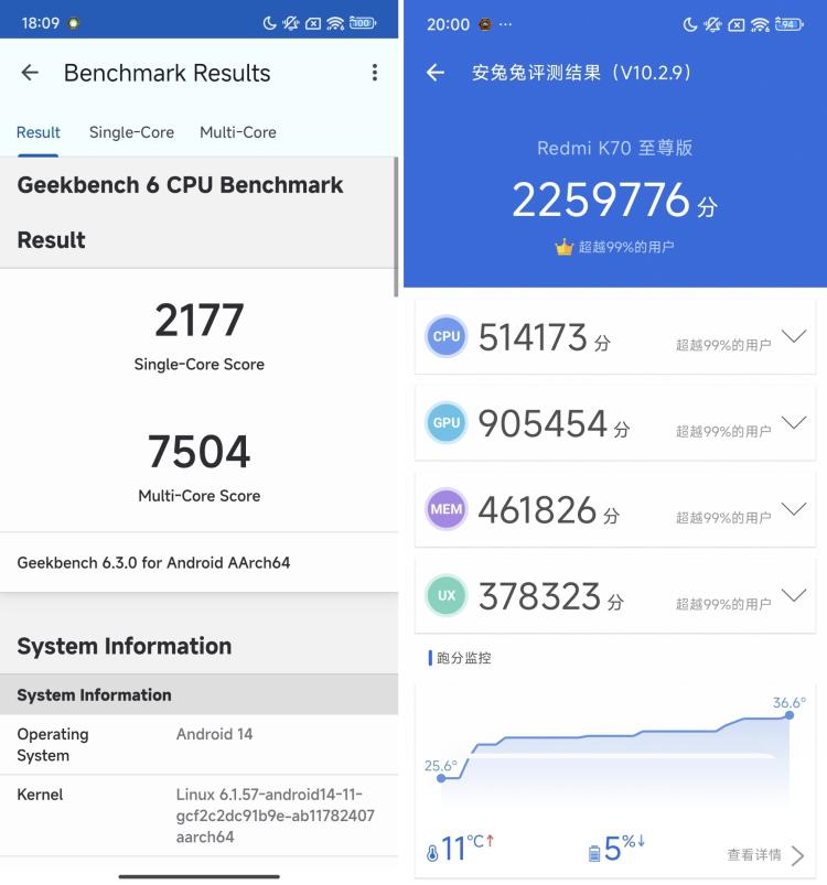 我们使用常规的 " 跑分三件套 " 对 K70 至尊版在开启 " 狂暴模式 " 下进行测试,安兔兔 V10 跑出了接近 226W 分的成绩,而 Geekbench 6 则有单核 2177、多核 7504 的跑分成绩。