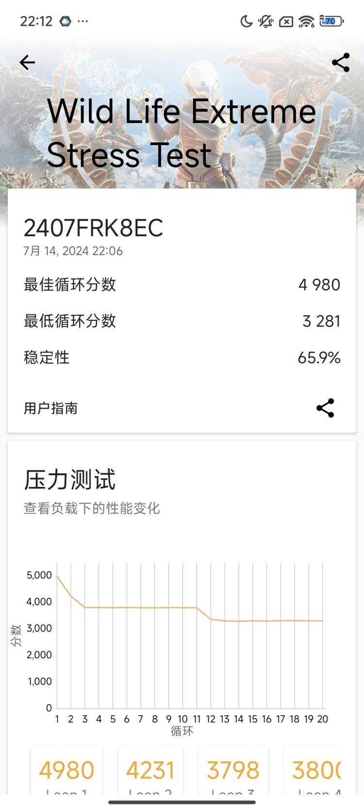 在模拟长时间重负载游戏的 3DMark Wild Life Extreme Stress Test 20 次循环测试中,K70 至尊版也得到了稳定性 65.9% 的成绩,前两轮测试在机身发热后数据有明显的下跌,但之后都保持着相对平稳的状态。