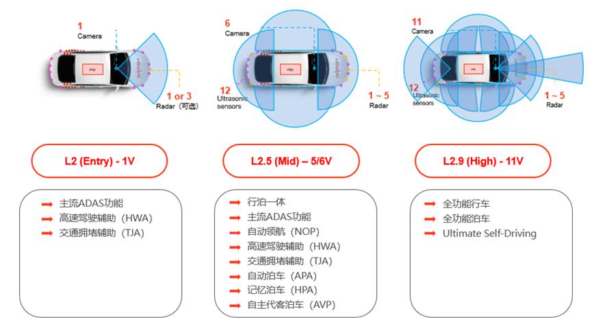2、搭载 5-6 颗摄像头,基于 8 TOPS 的算力芯片,实现包括高速 NOA、记忆泊车等智能辅助驾驶能力,且在泊车过程中可检测障碍物。