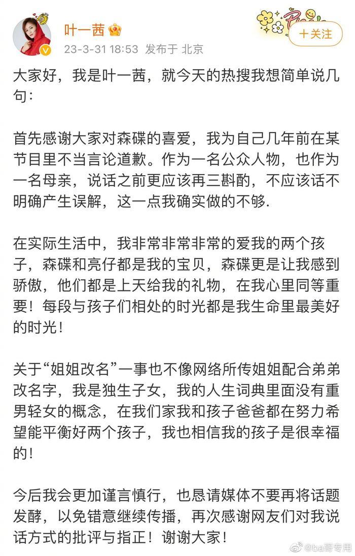 叶一茜表示,自己从不是重男轻女的家长,以前的节目言论有点口无禁忌,让大家产生了误解。