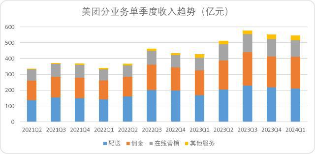 但环比来看,美团 Q1 营收增长就不那么明显了,相较于 2023Q4 营收下降了 1%。