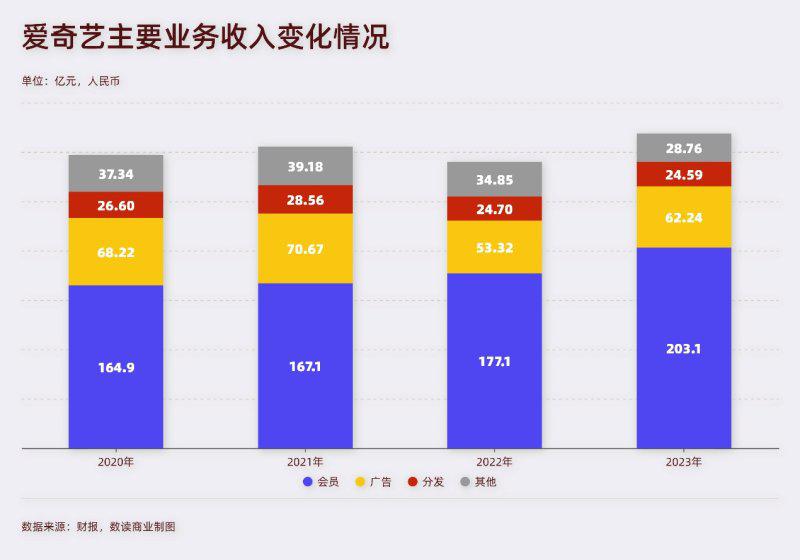 但其实," 一鱼多吃 " 更多是站在流媒体平台竞争的视角考量,无论怎么 " 吃 ",前提都是用户买单。穿透这一切,流媒体的主要营收来源还是广告和会员服务。从 2020 年开始,爱奇艺会员收入占比始终超过半数,再加上广告收入,这两部分业务占比常年都在 7-8 成左右。