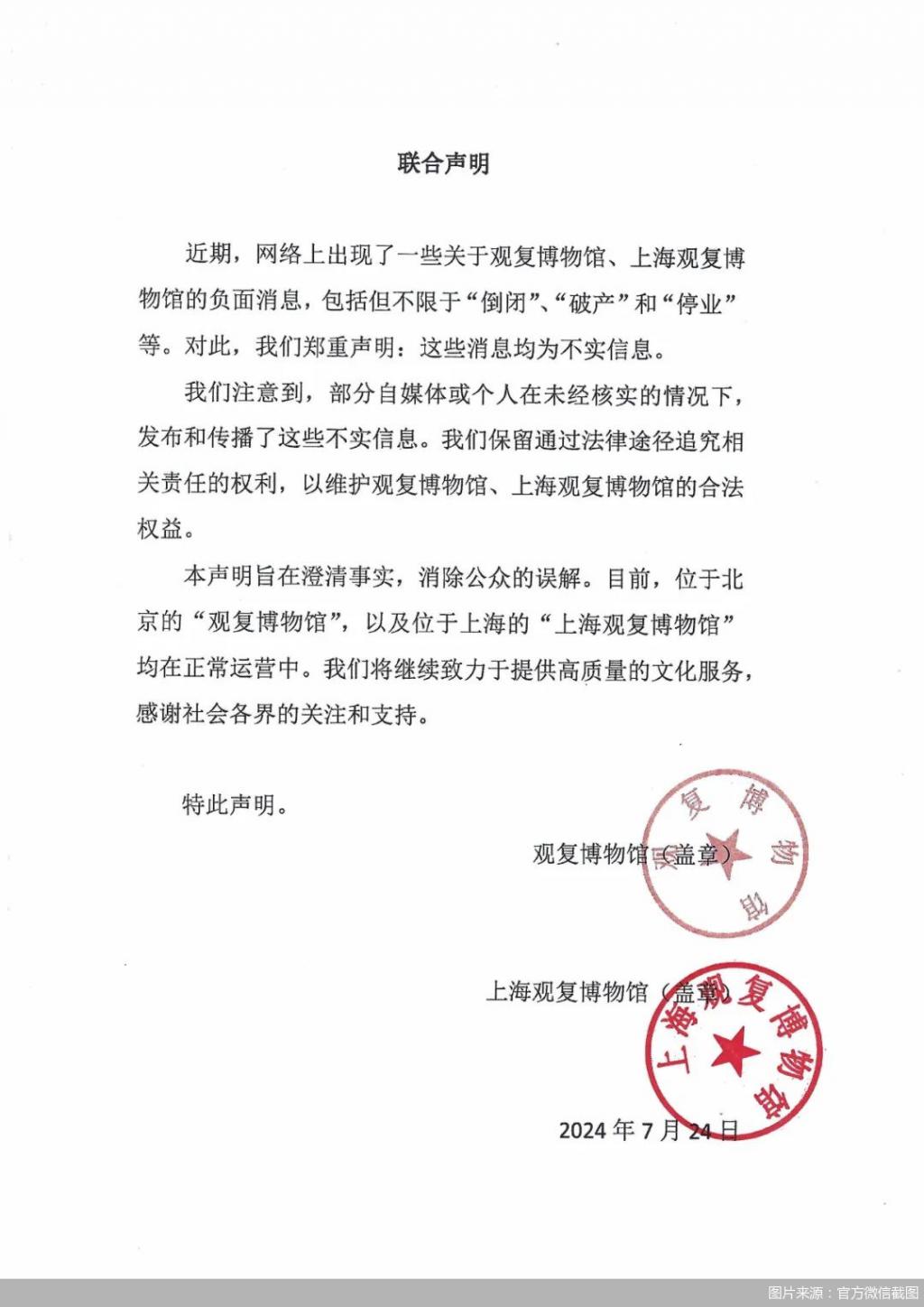 与此同时,观复博物馆官方微信发表声明称,近期,网络上出现了一些关于观复博物馆、上海观复博物馆的负面消息,包括但不限于 " 倒闭 "" 破产 " 和 " 停业 " 等,这些消息均为不实信息。